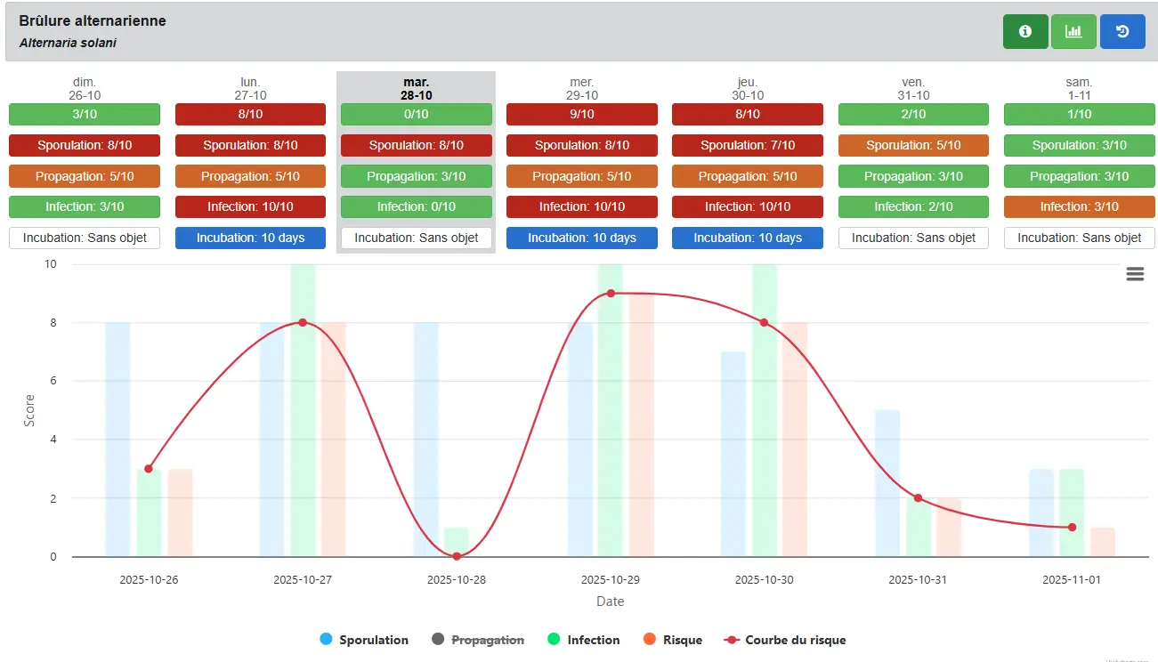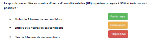 Le modèle utilise les données climatiques de la parcelle et calcule les différentes phases pour 7 jours. Le Hub@grimétéo présente le risque des différentes phases du champignon ainsi que l'historique de la saison.